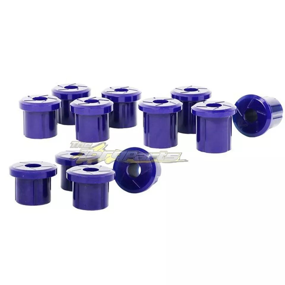 Specification Details Product Name SuperPro Bushing Vehicle Kit Description Kit contains all rear leaf spring bushes. Designed to stabilise rear axle movement and eliminate passive steering issues. Suitable for greasable shackles, enhancing performance under heavy loads or towing. Recommended Use Ideal for 4WDs experiencing wandering or instability under load or braking. Compatibility Designed for greasable shackles. Components Per Product 12 Bushings (12B)